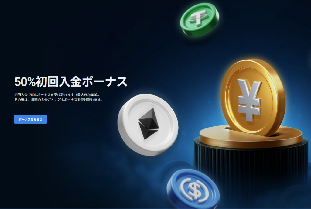 初回入金50%ボーナス(最大8万円、5万円以上入金対象)で資金を大幅に増やせます。2回目以降の入金でも20%ボーナス(最大150万円)が継続適用されます。