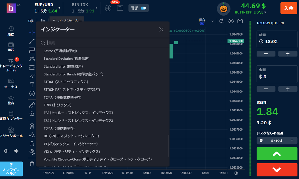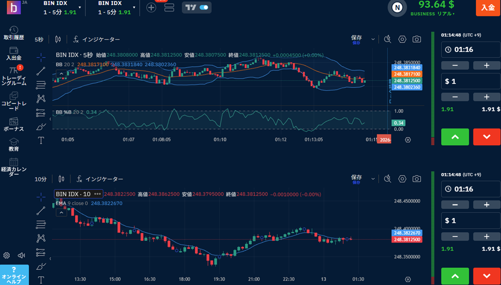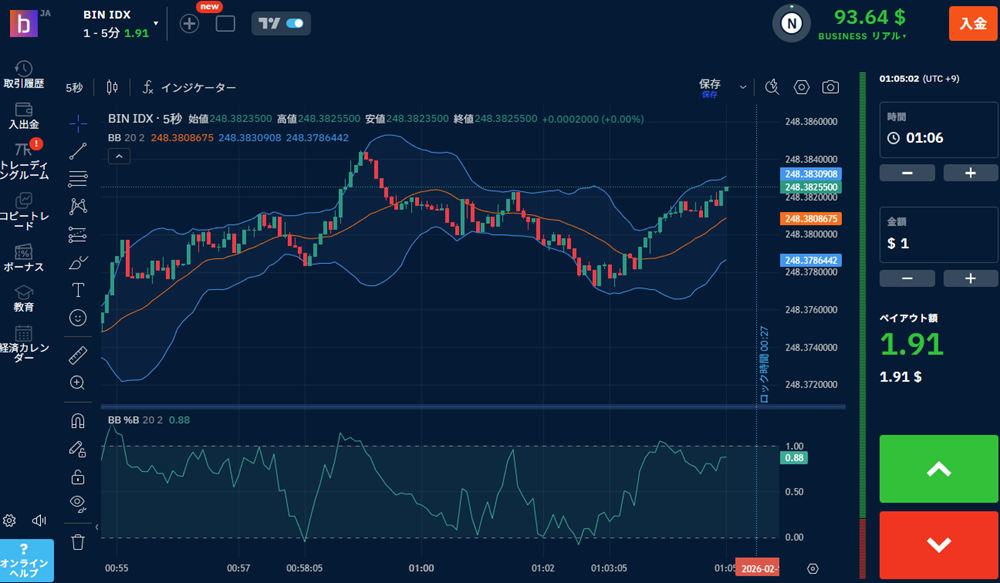 通常、BOで勝つためにはMT4などの外部チャートが必須ですが、ブビンガの取引プラットフォームには16種類以上のインジケーター(RSI、ボリンジャーバンド等)と多彩な描画ツールが標準装備されています。スマホ一台でプロレベルの分析が完結する利便性は、他社の追随を許しません。