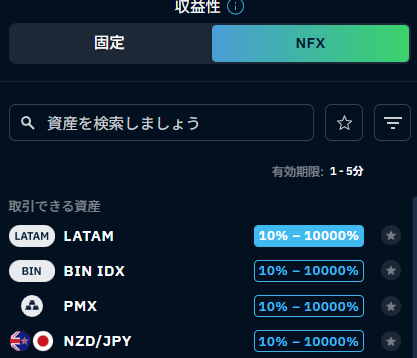 ブビンガを語る上で外せないのが、独自機能の「NFX(Non-Fixed Payout)」です。これは、従来のバイナリーオプションの「固定ペイアウト(例:1.85倍)」という常識を根底から覆す、まさに一撃必殺の取引モードです。
