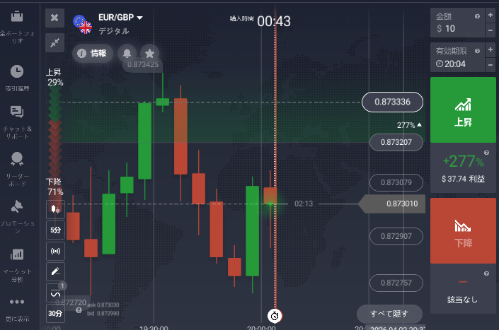 スマホでも指一本でサクサク操作でき、誤タップが極めて少ない設計。 5秒取引でも約定ズレがほとんどなく、「狙ったタイミングで確実にエントリー」できます。