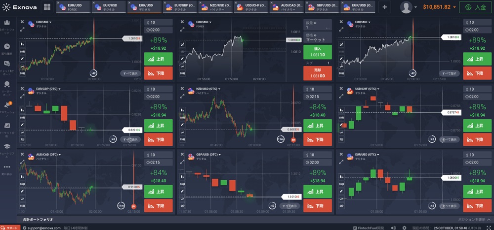 エクスノバは1アカウントしかも同じ取引画面上でバイナリーとFX/CFDの取引が行えます。