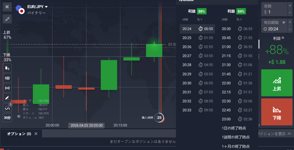 満期時間が決まっている(いわゆるクラッシック)タイプののバイナリーオプション。最長1か月先までの満期を選べます。
