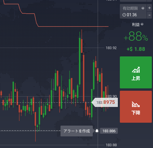 他社にもありそうでない機能「アラート」は使えます。バイナリーオプションはレンジ相場の場合、一定のラインで反発することが多いので、反発チェックラインに「アラート」を仕掛けてタイミングを待つというトレードが可能になります。