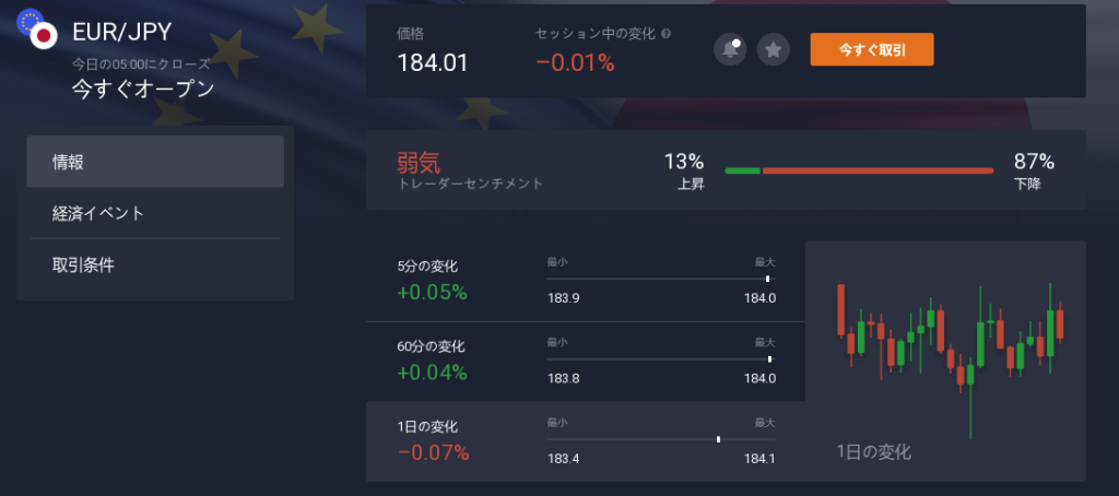 Exnovaには、取引資産の概要を一目で把握できる「情報」機能があります。この画面では1日を通してボックス相場なのかレンジ相場なのか、このタイミングではほかの人は強気とみているのか把握