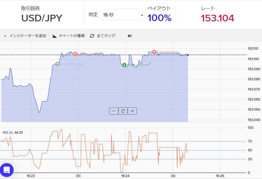 上記の取引はRSIを参考にエントリーしています。デフォルトの期間「14」では短期取引向きではいので、期間「5」にして15秒取引をしている画面になります。「ワンクリック注文」のONは必須ですが、ある程度クセが見えてくると勝てるポイントも増えてくると思います。
